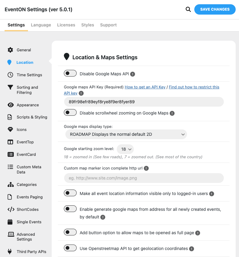 - In your WordPress dashboard, go to EventON > Settings > Google Maps API.