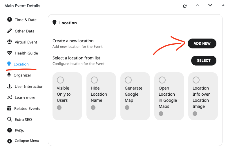 - In the Main Event Details metabox (usually in the sidebar or below the editor), scroll to the Location tab.