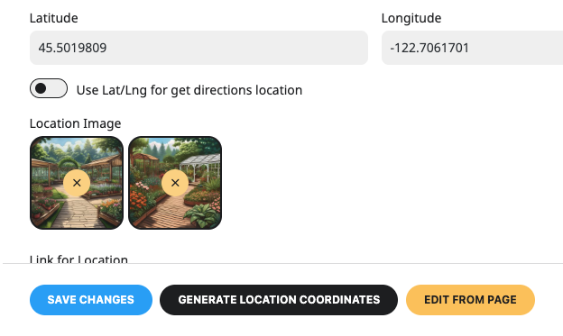 Note: When editing a saved location, a Generate Location Coordinates button appears next to Save Changes to refresh lat/lng if the address changes.