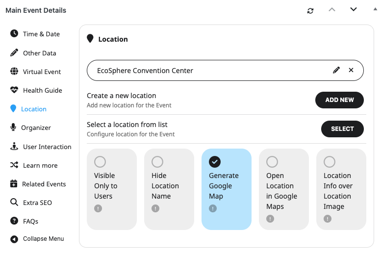 - In the Location section, check the Generate Google Map option (under Location Options).
