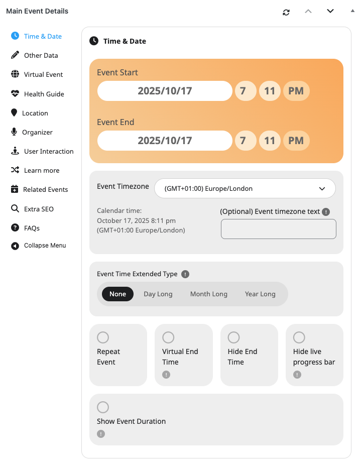 - Repeating events? Use the Repeat Event option in Time & Date section in Main Event Details for recurring setups.