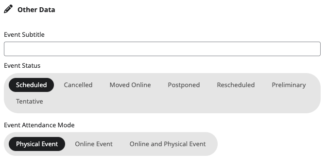 Event Attendance Mode | Set whether the event is, Physical Event, Online Event, or Online and Physical Event. Attendance mode will create a tag that will can be shown in eventTop (enabled via EventTop Designer). It will also populate SEO Schema data. |
