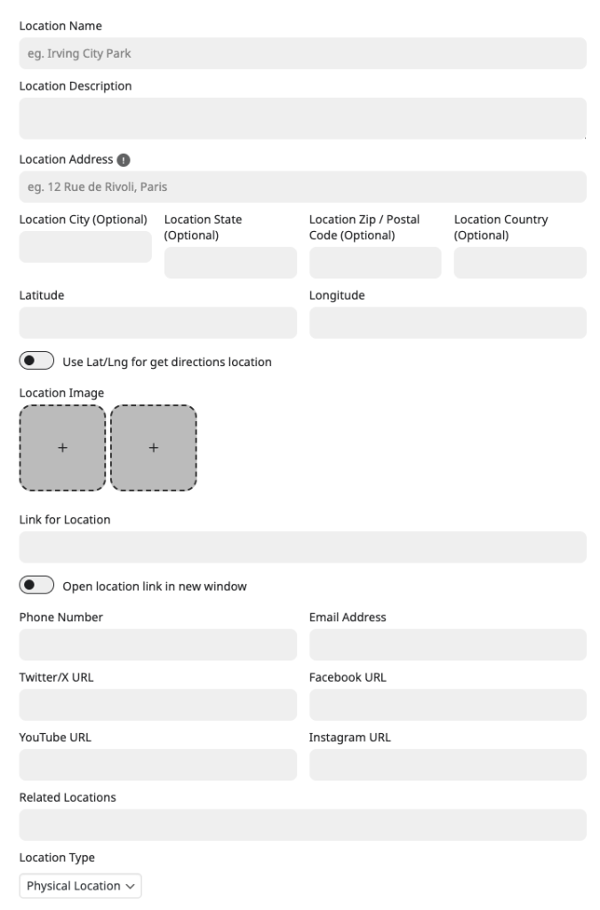 Location Type | Select whether this is Physical Location or Virtual Location. This will be populated in event’s SEO Schema data. |