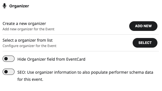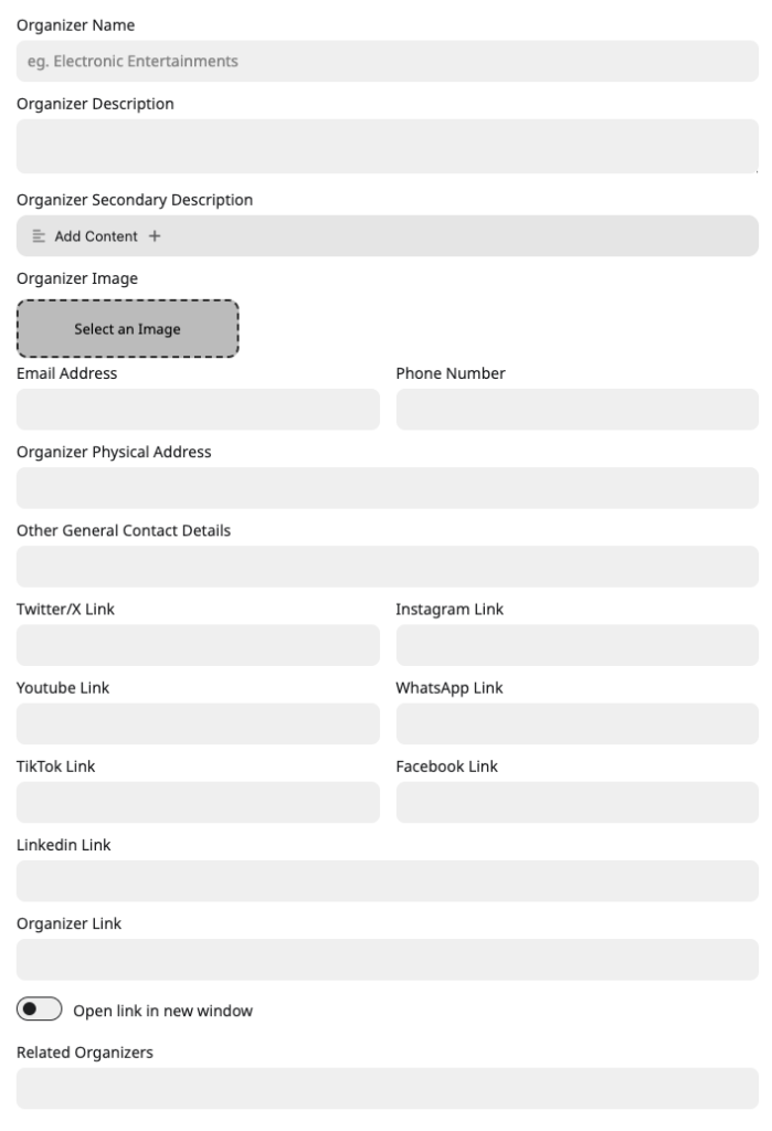 Organizer Image | Add organizer image by click Select an Image. |