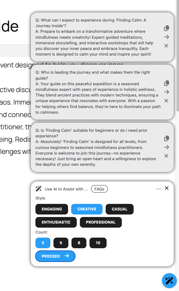 - The AI uses the event’s title and description to suggest set number of FAQs.